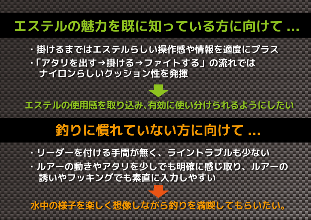 そう言った意味で、この「鱒ノ糸ナイロン」を開発するにあたってエステルらしさは強く意識していました。極端な話、エステルらしく表現するための限界値を見つけられれば、あとは開発をする上でも整理しやすいと考えたからです。