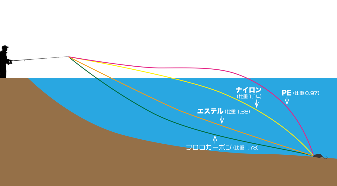 エステルラインの比重が1.38に対して、ナイロンラインの比重は1.14。上イラストの通り、一般的なナイロンラインは水の中で浮きやすい傾向にあります。