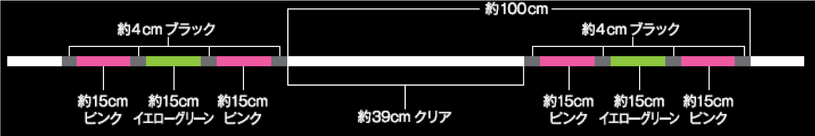 鮮やかに発色する高視認性カラーのピンクとイエローグリーンの間にブラックマーキングを施すことで、糸全体の視認性にコントラストが生まれ、よりメリハリのある視認性を実現。